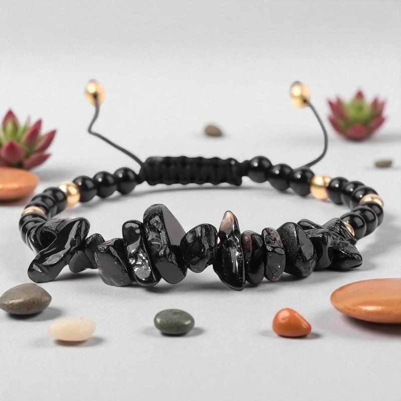 Etniska armband i geometrisk stil med naturliga stenar och flätad design.